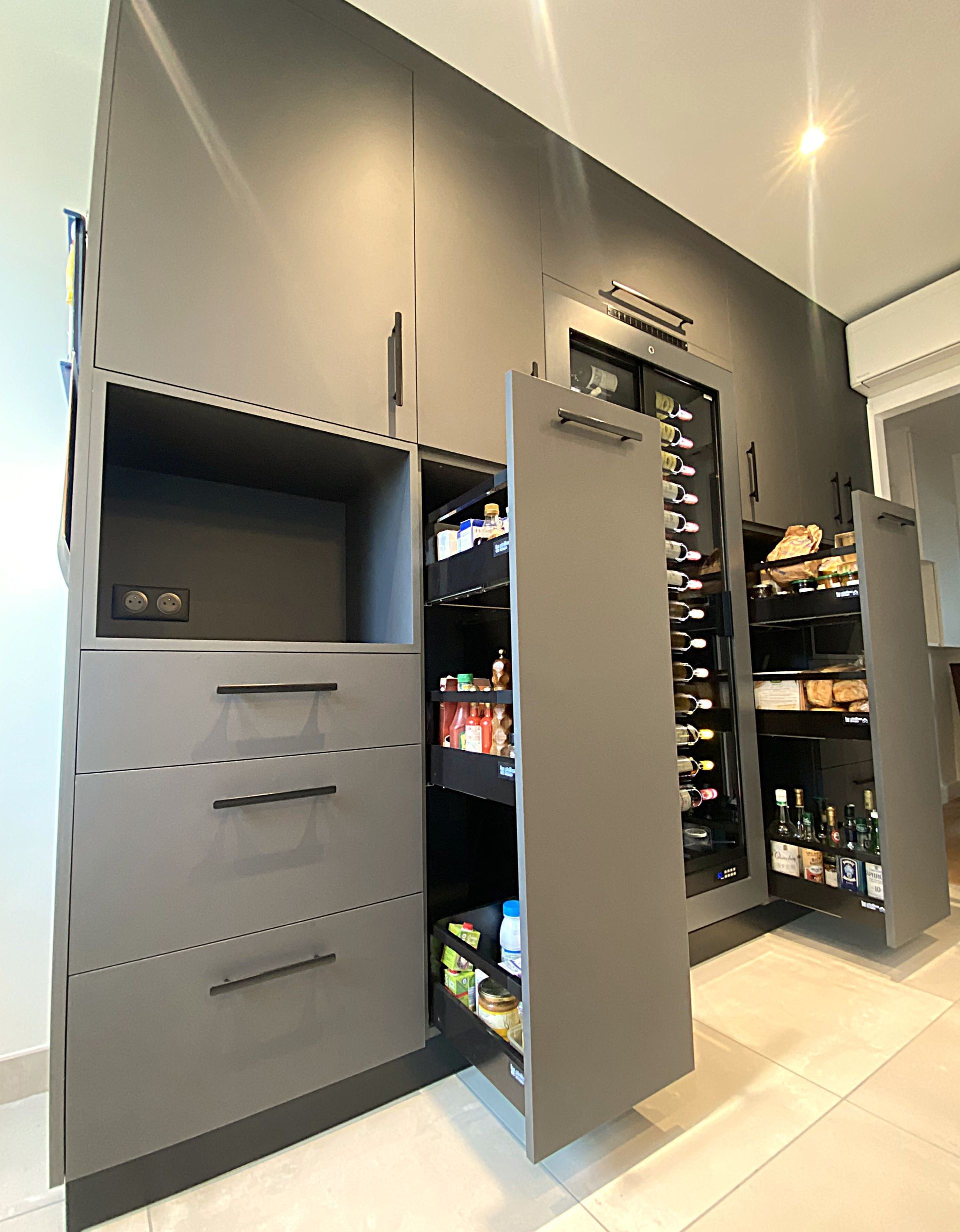 Les tiroirs compartimentés, les colonnes coulissantes, les range-épices encastrés et les systèmes de tri des déchets optimisent l’organisation et le confort d’utilisation.