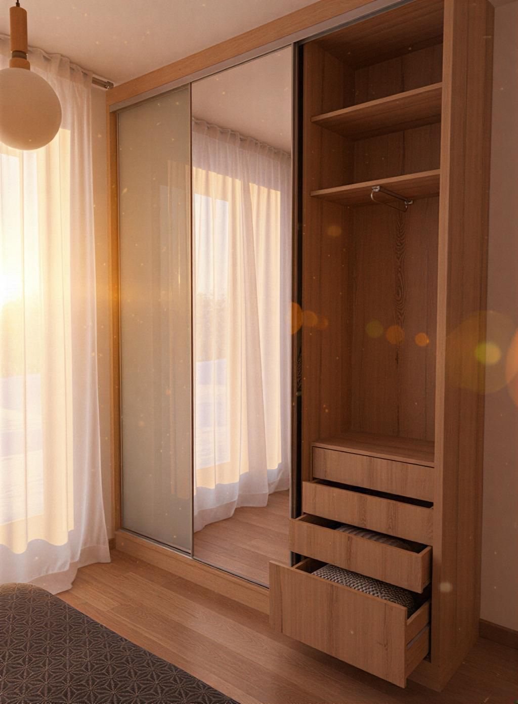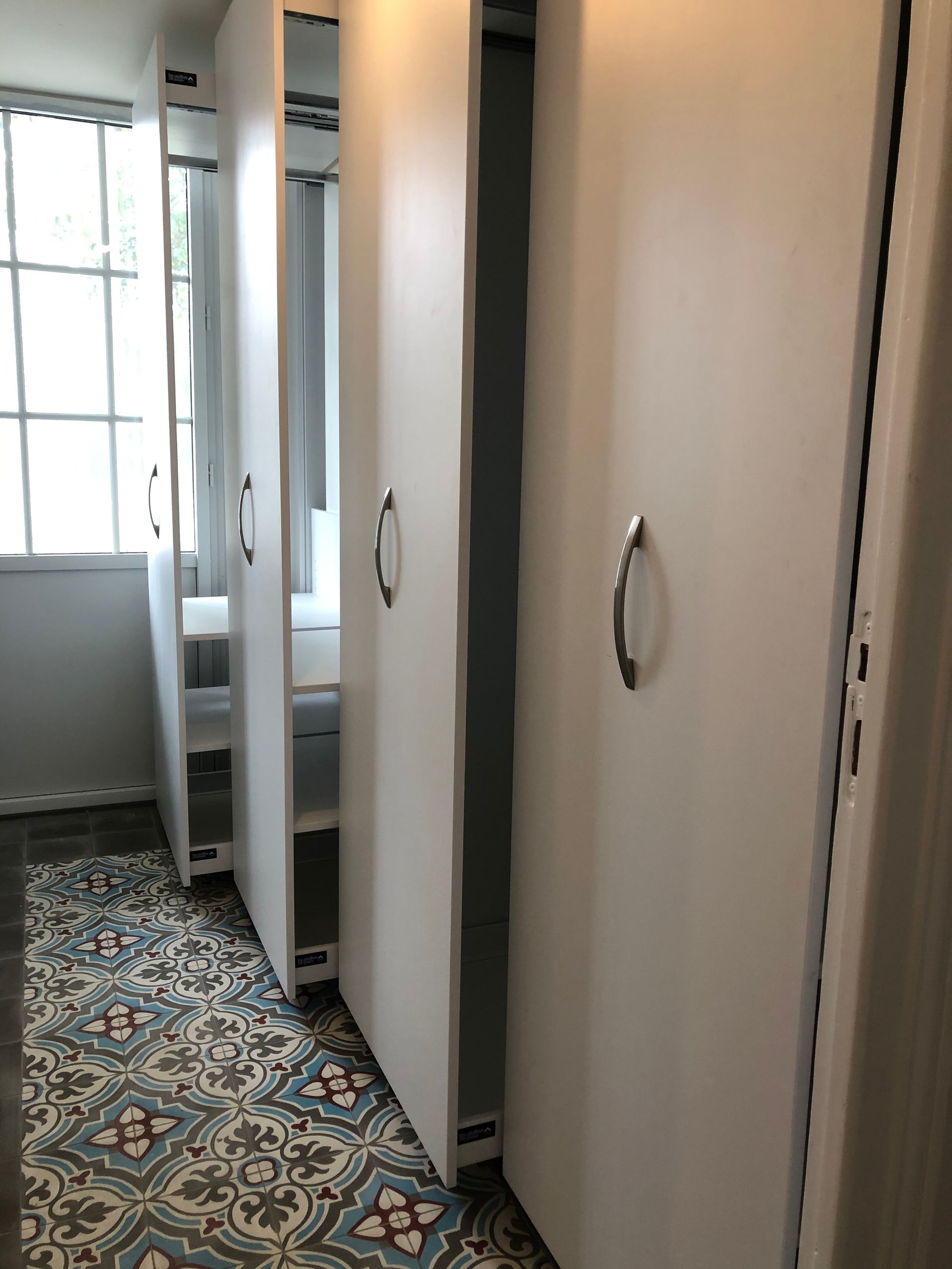 Nous privilégions les portes coulissantes, les structures encastrées, les rangements modulables et les façades à miroir pour maximiser le volume utile tout en apportant légèreté et élégance à votre pièce.