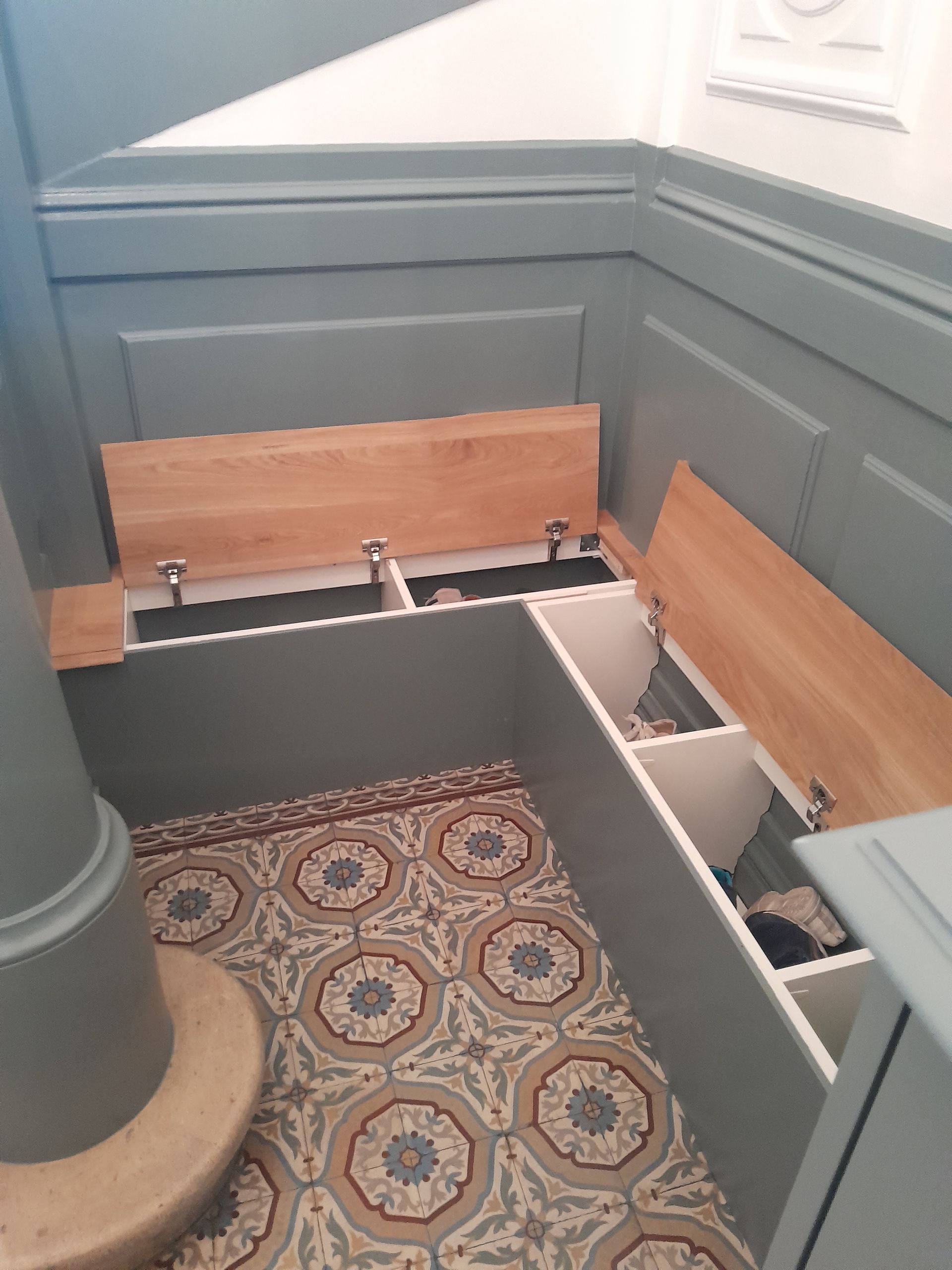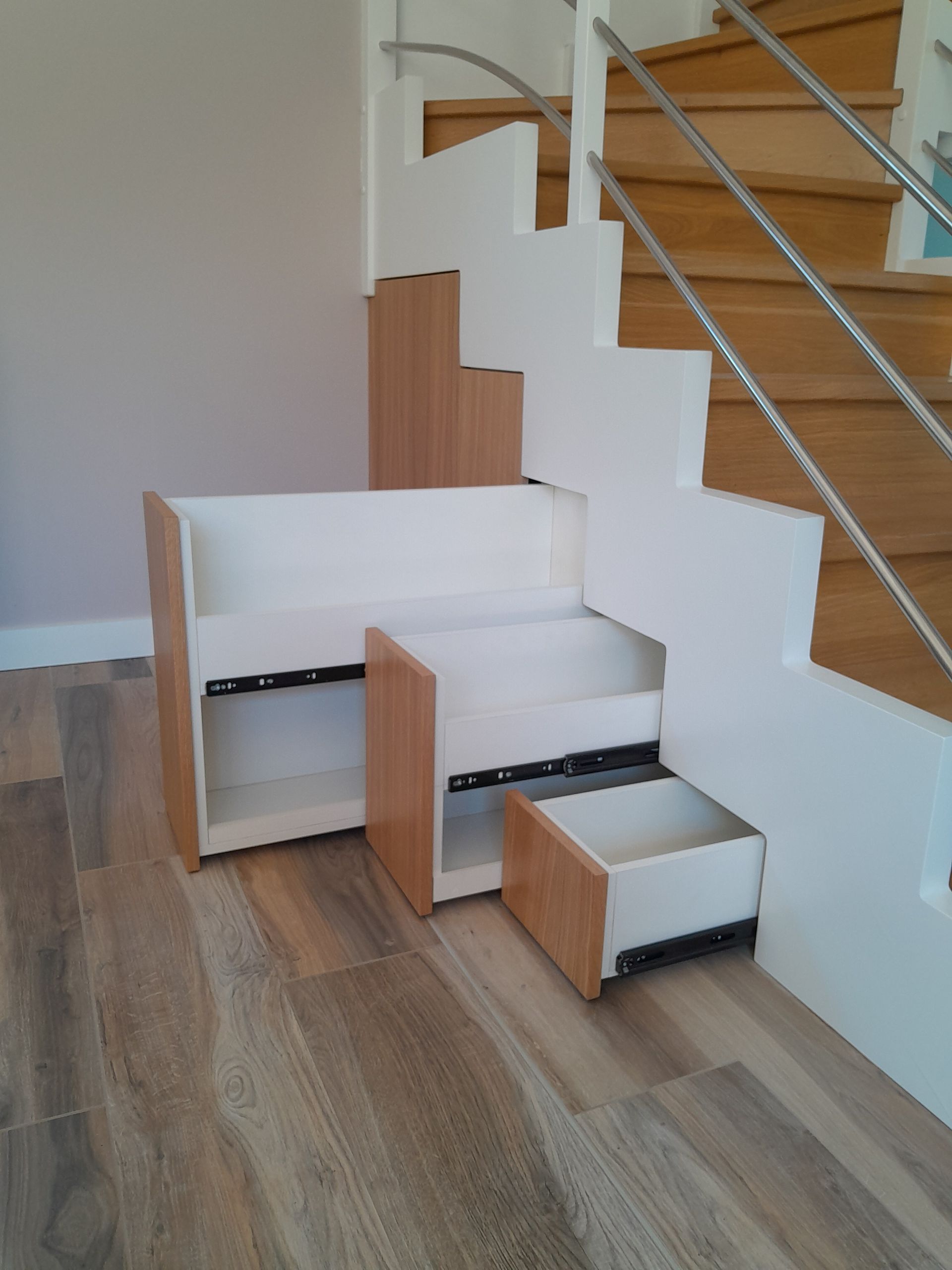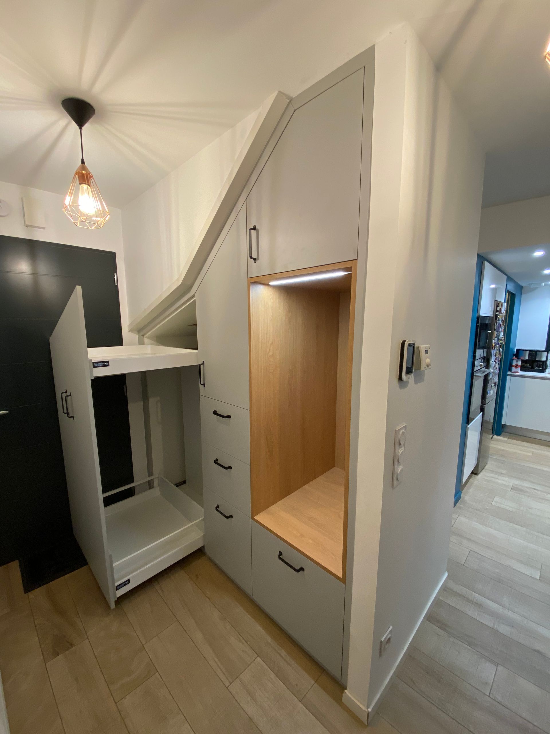 - meuble sous escalier avec tiroirs coulissants ou penderie intégrée ;