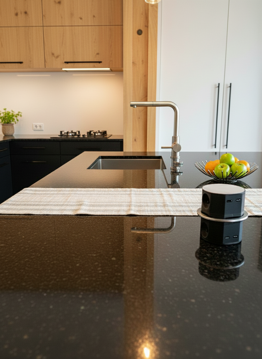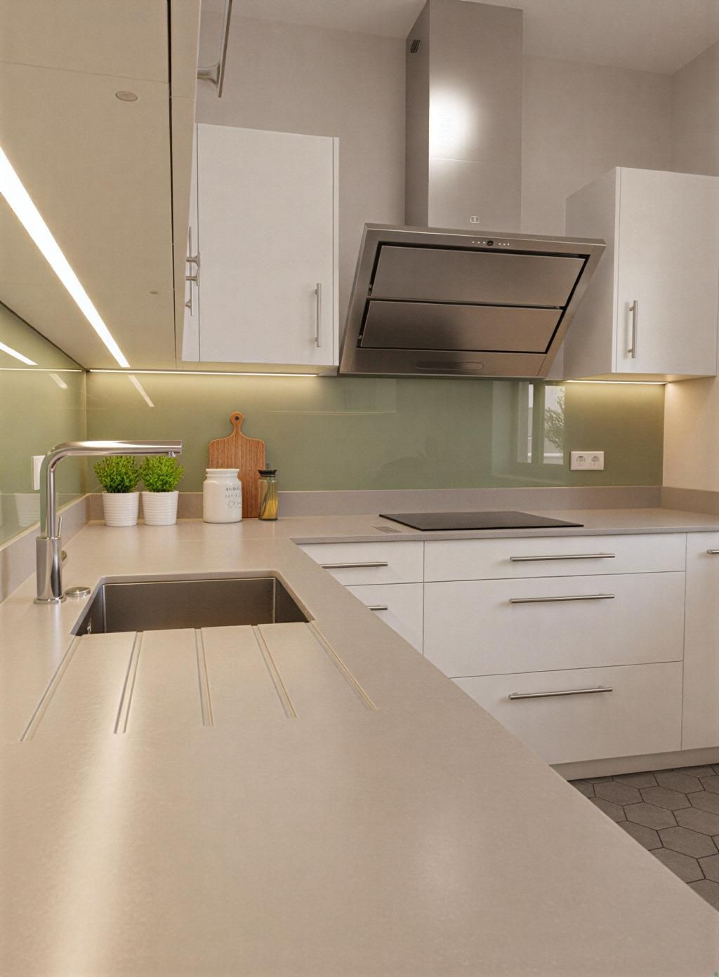 Intégrez des accessoires et des éléments fonctionnels comme des prises encastrées, des zones de découpe, des rebords antiéclaboussures ou des rangements sous plan.
